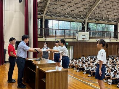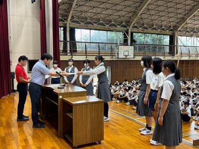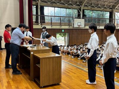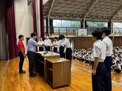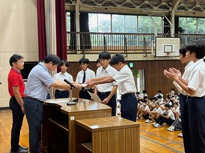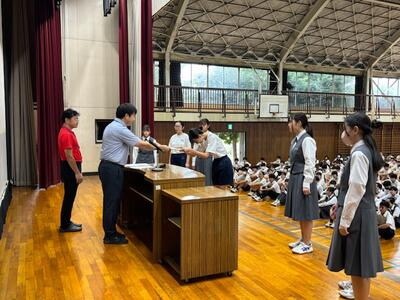 新人大会、発明創意工夫展、読書感想文、ボランティアの表彰を行いました。受賞された皆さん、おめでとうございます。