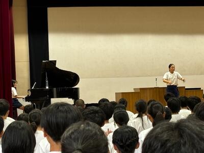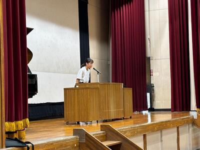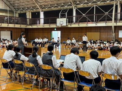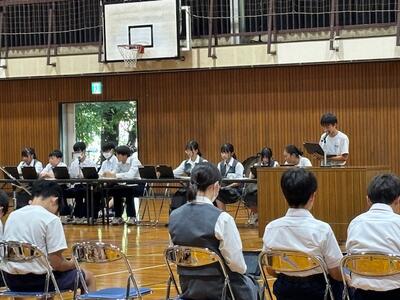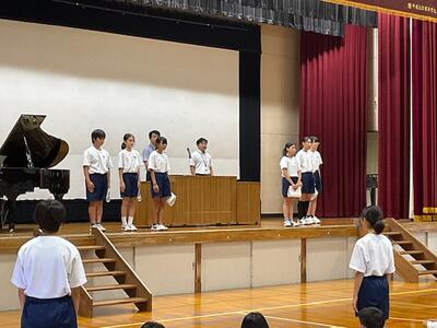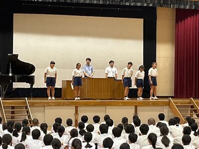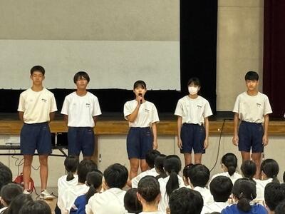 体育祭や校外学習、宿泊学習と大きな行事が多い1学期が終わりました。各学年から1学期の成果と課題が発表されましたが、行事に関する事、生活に関する事、学習に関する事など、自分達の実態を踏まえ、この先を見据えて語ってくれました。コロナが終息し当たり前になりましたが、全員で歌う校歌は、やはり良いですね。指揮も伴奏もとても良かったです。