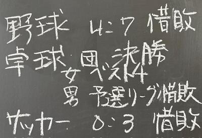 1年の中で1番大きな大会である学校総合体育大会が行われました。少し時間が経ってしまいましたが、結果を載せます。3年生お疲れ様でした。県大会出場の生徒はさらなる活躍を期待しています!