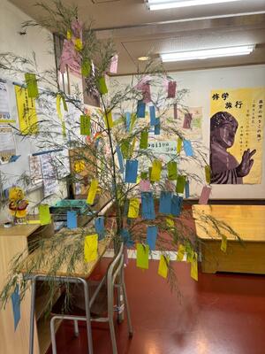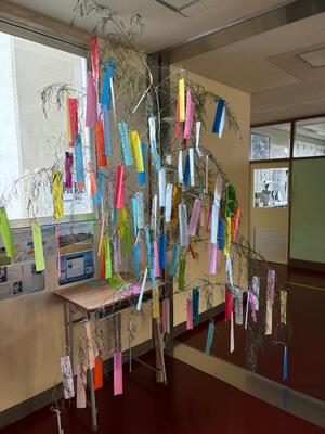 校内に竹を設置し、願いを短冊に込めて飾りました。今年は彦星と織姫は会えたかな。皆さんの願いも叶いますように。