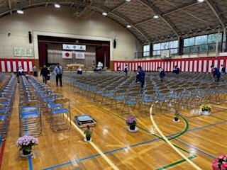 昨日5日(金)は準備登校。花壇は庁務手さんが周年の42をパンジーで表してくれました。格好がいい並びです。体育館にて新しい職員の紹介と部顧問の発表、その後、校長先生からの話がありました。入学式の準備もぬかり無く徹底して行う姿が立派でした。写真でも椅子がまったくズレていないことが分かりますね。昇降口の飾りも賑やかで新入生が喜んでくれそうです。新年度のスタートを気持ち良く切ることができました。