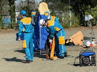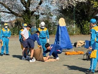 指導・好評ということで教頭からは東日本大震災時の自らの担任としての経験を交えて話をさせてもらいました。警察の方からは、今後も意識して欲しい事をお話いただくとともに、避難時に活躍する用具、さらに棒と毛布で簡易的に作ることのできる担架の実演があり、生徒も体験させてもらいました。