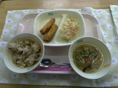 今日の給食は、中華ご飯、カレー春巻き、春雨サラダ、中華スープでした。中華ご飯は、具材がご飯に入っていて美味しかったです。カレー春巻きは、春巻きの具材とカレーが美味しく絡んでいました。春雨サラダは、ツナと春雨とキャベツが美味しくたくさん食べられました。中華スープは、たけのこがシャキシャキしていて美味しかったです。