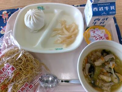 今日の給食は、牛乳、ちゃーめん、かた焼きそば、肉まん、大根のオイル漬け、フルーツ杏仁プリンでした。ちゃーめんは特別感があり、パリパリしていて新しかったです。大根のオイル漬けも安定の美味しさでした。フルーツ杏仁プリンは果肉がいっぱいで甘酸っぱかったです。