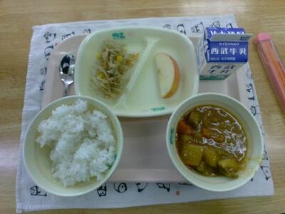 今日の給食は、牛乳、ご飯、ポークカレー、ごぼうサラダ、りんごでした。ポークカレーは具材がたくさん入っていて食感も味も楽しめました。りんごはシャキシャキしていてみずみずしくて美味しかったです!