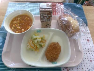 今日の給食は、チーズボックス、コーヒーミルク、ポテトコロッケ、ポークビーンズ、コールスローサラダです。ポテトコロッケはサクサクしていてすごく美味しかったです。