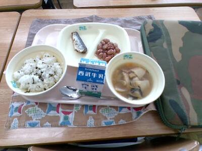 今日の給食は、わかめごはん、牛乳、煮ぼうとう、金時豆の甘煮、鰯の梅煮です。わかめごはんは、わかめの風味が効いていて魚といっしょに食べるとすごくまっちしていて魚のタレが甘みを引き出していてすごく美味しかったです。煮ぼうとうは、もちもちのしろいものが凄く滑らかで食べ心地が良かったです。牛乳はいつもどおり美味しいです。金時豆は甘みが効いていて凄く美味しかったです。あとはデザートをもっと増やしてほしいです。