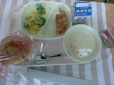 今日の給食では、フライドチキンとブロッコリーとコーンのサラダは美味しかったです。クラムチャウダーはアサリが入っていて美味しかったです。クリスマスケーキはチョコで美味しかったです。