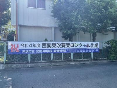 吹奏楽部の西関東大会出場のお祝いで、後援会からのぼりをいただきました。正門に掲示してあります。とても立派で、大会に向けて士気が上がるのぼりです。