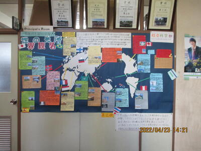 本日までとなりましたが、『世界の観光名所』についての掲示発表でした。地図の精巧さ、各国の詳しい情報など、素晴らしいまとめでした。