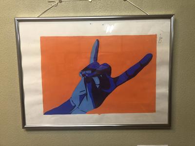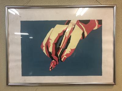 美術部2年生が展示を行いました。手の動きを決め、色面構成で描きました。