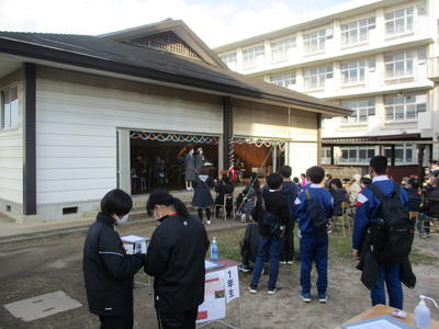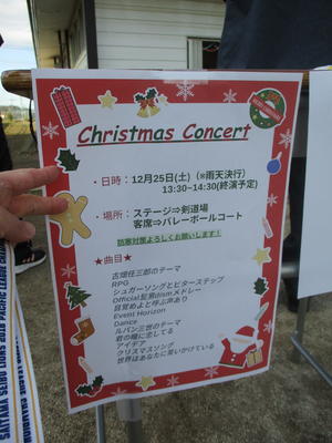 吹奏楽部によるコンサートが行われました。プログラムにあるように、クリスマスの曲を含め約1時間たっぷりと演奏しました。後半は北風が強くなり寒さが増しましたが、手拍子をしたり歌詞を口ずさんだりして盛り上がる曲が多かったです。プログラムは、生徒が端末を使って自分で作成したとのことで、これも素晴らしいと思います。