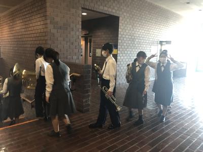 吹奏楽部の代表生徒が、金管、木管の2グループで参加します。間もなく本番です。(狭山市民会館にて)
