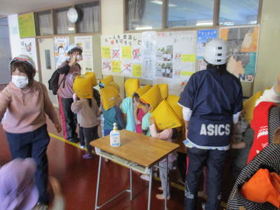 あかねの虹保育園の園児と先生が来校しました。実際の避難を想定し、場所や移動の仕方、非常食・水などを体験しながら確認していました。園児の皆さんは挨拶ができ、先生の話ををよく聞いていてお利口でした。
