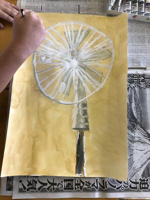 6組美術・・・2年生の作品です。2枚目の扇風機を描きました。上手ですね。3枚目はお面の仕上げ作業中です。