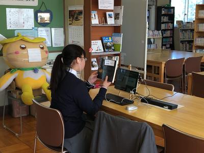 埼玉県図書館協会主催『図書館と県民のつどい埼玉2021 中学生ビブリオバトル予選会』に2名の生徒が参加しています。制限時間5分でお勧めの本を紹介し合います。トコろんも応援してくれています!