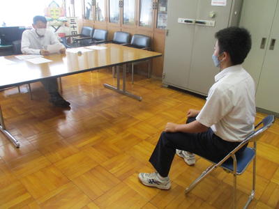 廊下で順番を待っている時は緊張している生徒が多いですが、校長室で練習が始まると、質問に対して堂々と答えたり、作法について確認したりすることができました。良かった点と課題点を伝えていますので、本番でよりよい面接になるようにしてほしいです。
