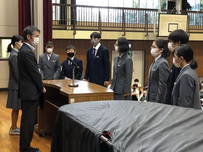先日の選挙により当選を果たした生徒に校長より任命書を授与しました。初仕事として、代表で生徒会長から挨拶がありました。すべての生徒の意見を吸い上げ、より素敵な学校にしていきたいと力強く宣言していました。