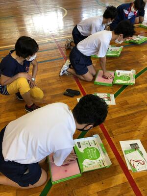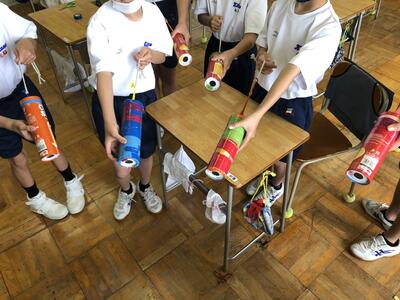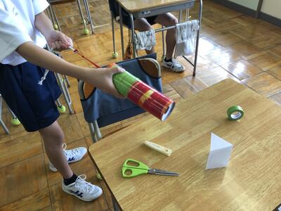 Mr.クボックによる風の手品が披露された後、お菓子の空き箱を使って空気砲を作りました。工程は少ないのですが、風船の口を結ぶなど緻密な作業がありましたが、無事に完成しました。飾り付けも各々で好みで仕上げました。今日は作成したものを試す時間が無かったので、後日試してみたいと思います。