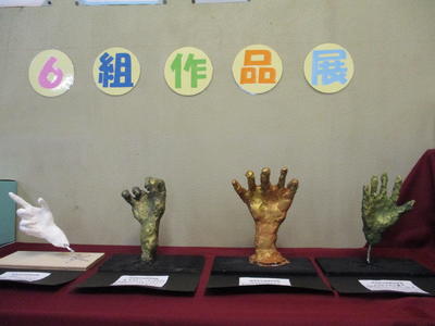 市役所で行う予定だった『ふれあい作品展』が中止になったため、校内2階スペースにて『6組作品展』を開催中です。写真は一部で、他にも通りかかった方が足を止めて見入るような作品ばかりです。
