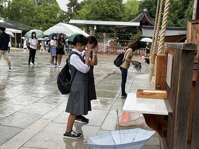 雨の中の大変ですが、濡れるのを苦にすることなく、傘を置いてお参りしています。