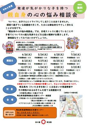 親自身の心の悩み相談会 投稿: 教頭 (2022/04/02) カテゴリー: 連絡事項 埼玉県発達障害総合支援センターからのお知らせです。 https://www.pref.saitama.lg.jp/soshiki/b0614/ -