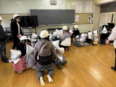 先月のあかねの虹保育園に続き、あかねの風の園児の皆さんの避難訓練が行われました。虹の皆さんと同様に静かに移動したり、よく話を聞いたり、たくさんお話をしてくれたりしました。到着し、非常食を食べましたが、「甘くて美味しい」「チョコみたい」「クワガタのえさの匂いがする」など、職員の方が工夫したものに喜んでいました。