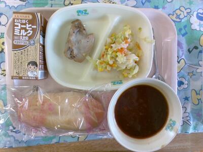 今日の給食はチキンカレーが出ました。チキンカレーをご飯と合わせてカレーライスにして食べるとすごく合い美味しかったです。ポテトコロッケも中の具材がたくさん入っていて美味しかったです。(1-4給食委員)