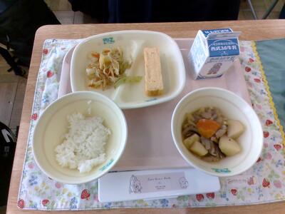 今日の給食は、肉じゃが、ご飯、牛乳、厚巻き卵、おかか和えです。肉じゃがは、とても美味しく、意外にもご飯とマッチして、すぐに食べ終わりました。さらに、厚巻き卵はおかわりじゃんけんでも人気でした。私も参加しましたが、廊下に声が響き渡りました。おかか和えは、とても野菜とおかかがの相性がよく、美味しくお箸がよく進みました。