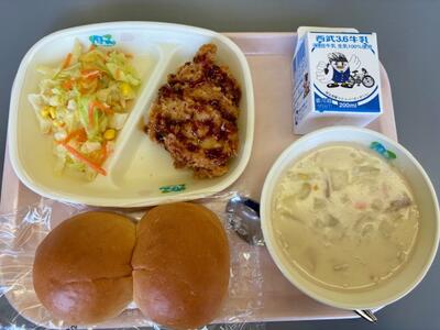 今日はポークシチューが出ました。ポークシチューはソフトフランスパンととても相性がよく一緒に食べるとどちらの旨味も引き出されとても美味しかったです。他にも鶏肉の香草焼きやコールスローサラダはしつこい味もなくペロリと食べられとても良かったです。(1年2組給食委員)