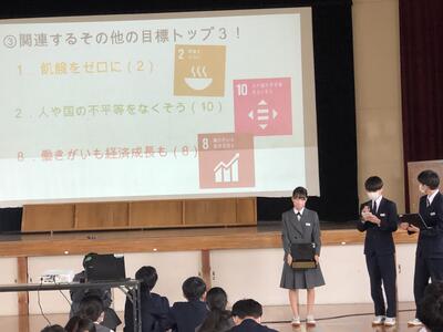 3年生全員が集まり、これまで調べたことをもとにSDGsについて発表しています。17の目標ごとに担当を割り振り、パワーポイントにまとめました。導入では、クイズを出して他の生徒の興味や関心を高めていました。その後は目標が必要な理由を現状や課題をもとに説明し、その上で効果的な取り組みや実践例、関連する目標トップ3を挙げました。終末には問題を解決すべく自分自身で出来る事や発展的な内容をプレゼンしました。