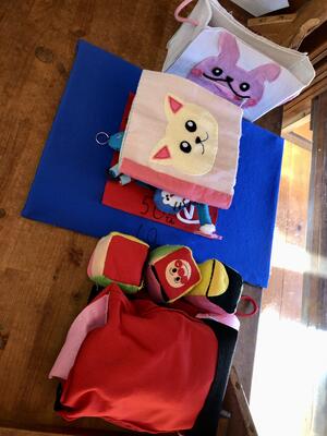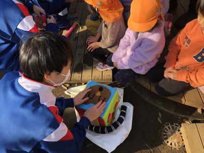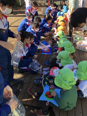 初めと終わりに学級の代表で生徒が挨拶をしたのですが、子ども向け番組のおにいさん、おねえさんみたいで、園児の皆さんがよく話を聞いていました。おもちゃは細かく本物みたいに作られたいちごやアイスクリーム、さかななどの人形、キャラクターのおもちゃ、絵本タイプのもの、5歳児は的当てや魚釣りが人気でした。福笑いは変顔になって大爆笑、口が付いて食べさせてあげるおもちゃは被っておめんにしてベロを出して(こういう芸人さんがいますよね)遊んでいて、これまた大爆笑でした。