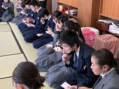 3年生クラスごとでの茶道教室でした。クラス全員で輪になり顔を合わせて楽しい時間を過ごせるのもあと少し、緊張する場面もあり、リラックスして楽しく過ごす場面もありと、貴重な時間を過ごしました。