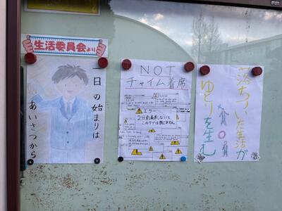 正門の掲示板に生活委員さんが自作のポスターを掲示してくれました。どれも実現させようと思わせてくれるアピール度が抜群なポスターですね。