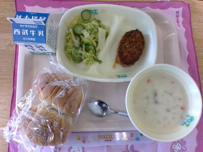 本日の給食はバターロール、ハンバーグのデミグラスソース、グリーンサラダ、クラムチャウダーでした。ハンバーガーにしていただきましたが、濃厚なデミグラスソースがパンとマッチして美味しかったです。(魚料理のレシピを増やしたいところでスモークサーモンに着目しクリームパスタを作りましたが、なかなか簡単で家族からも好評で喜ぶ教頭)