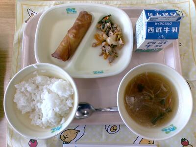 今日の給食はご飯、牛乳、春巻、豚肉とキムチの炒め物、春雨スープでした。