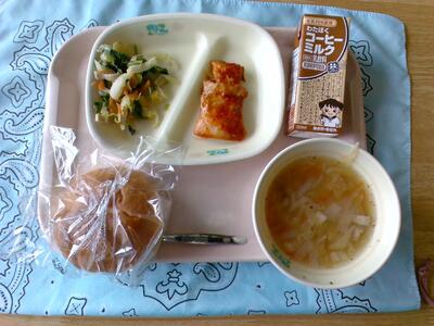 今日の給食は、ライスボールパン、コーヒーミルク、鶏肉のトマトソース、ほうれん草サラダ、ABCスープです。