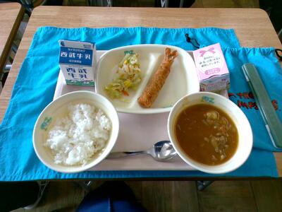 今日はポークカレー、エビフライ、コールスローサラダ、お祝いケーキでした。