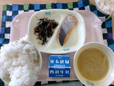 今日の給食はごはん 牛乳 鮭の塩焼き ひじきと大豆の炒め物 豚汁味噌汁でした