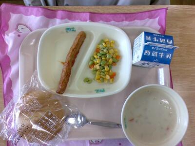 今日はクラムチャウダーが出ました。中に野菜とともにアサリがたくさん入っていて味も食感も楽しめました。パンと一緒に食べるとより美味しさが増して美味しかったです。(2−2 給食委員)