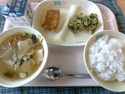 今日の給食は、ご飯、牛乳、イカの竜田揚げ、チンゲン菜ののりサラダ、ワンタンスープでした。
