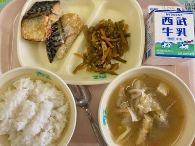 今学期最後の給食は、ご飯、牛乳、鯖のカレー焼き、茎わかめの炒め煮、春キャベツの豚汁でした。
